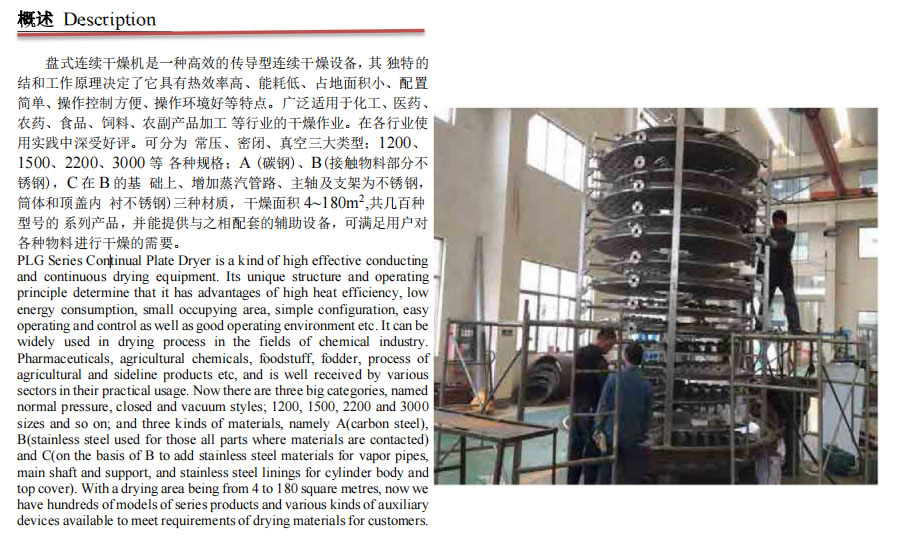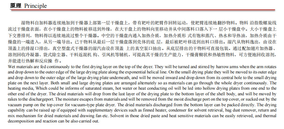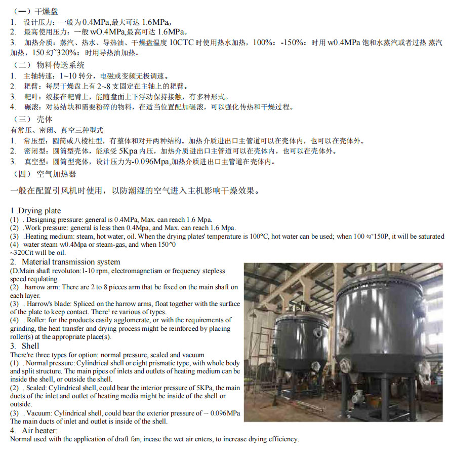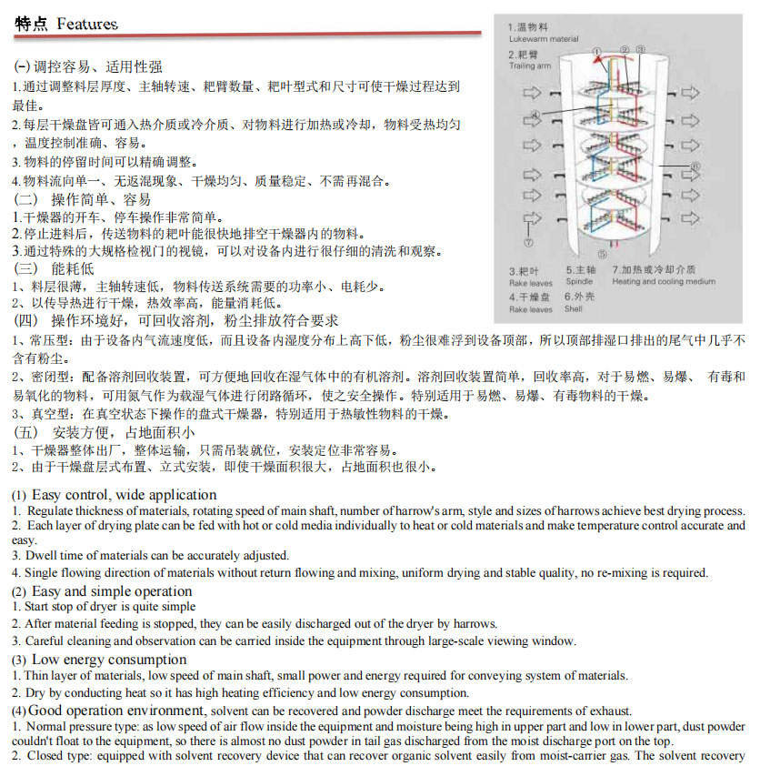 簡介:盤式連續(xù)干燥機是一種高效的傳導(dǎo)型連續(xù)干燥設(shè)備,其 獨特的 結(jié)和工作原理決定了它具有熱效率高、能耗低、占地面積小、配置 簡單、操作控制方便、操作環(huán)境好等特點。廣泛適用于化工、醫(yī)藥、 農(nóng)藥、食品、飼料、農(nóng)副產(chǎn)品加工 等行業(yè)的干燥作業(yè)。在各行業(yè)使 用實踐中深受好評。可分為 常壓、密閉、真空三大類型;1200、 1500、2200、3000 等 各種規(guī)格;A (碳鋼)、B(接觸物料部分不 銹鋼),C 在 B 的基 礎(chǔ)上、增加蒸汽管路、主軸及支架為不銹鋼, 筒體和頂蓋內(nèi) 襯不銹鋼)三種材質(zhì),干燥面積 4~180m2,共幾百種 型號的 系列產(chǎn)品,并能提供與之相配套的輔助設(shè)備,可滿足用戶對 各種物料進行干燥的需要。